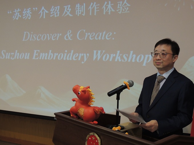 张宜琪副总领事、王义教育参赞在学习苏绣