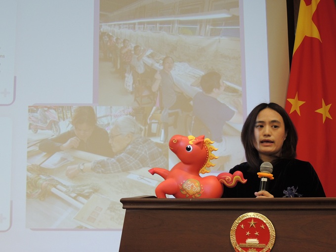 总领馆还邀请苏绣大师讲解苏绣和指导与会人员练习苏绣,激发起美国学生、老师、校长学习苏绣的热情。