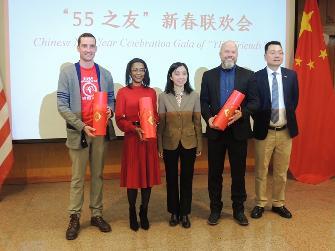 张宜琪副总领事向美国校长赠送春节礼物,左起,塔夫特高中校长Ryan Glowacz、威斯汀豪斯学院预备高中副校长Diamond Bogard、张宜琪副总领事、林肯公园高中校长Eric Steimiller、王义教育参赞