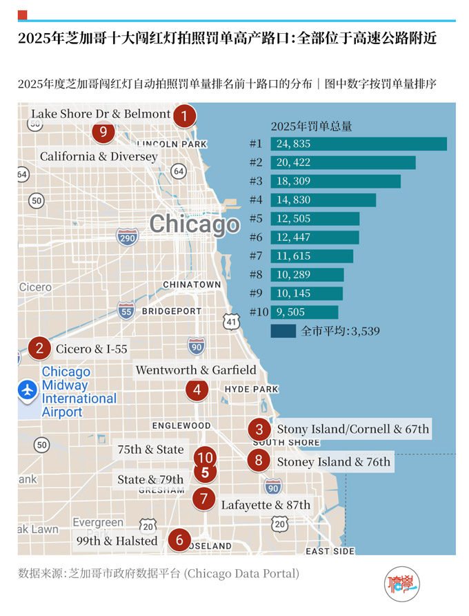 【芝加哥侨学网“数读芝加哥”专栏作者Sihang】芝加哥全市300多个闯红灯摄像头,2025年共开出了约53万张罚单,数量惊人。闯红灯罚单最多的十个路口,全部位于高速(准高速)匝道与本地街道交汇处的路口,其中七个位于南城区。