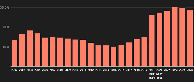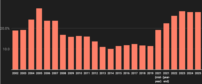 从更多年份的数据来看,密歇根大道的商户空置率虽然较2023年28.2%的峰值略有下降,当仍然没有出现明显的回落迹象。