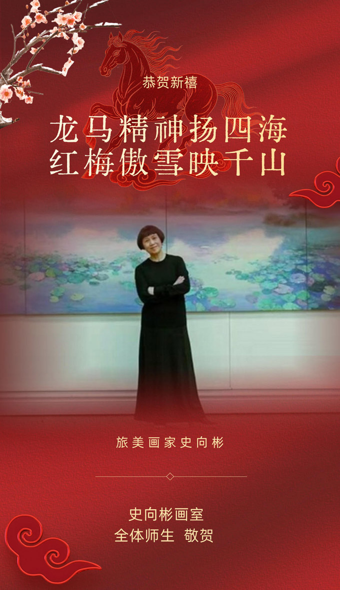 史向彬画室:龙马精神扬四海,红梅傲雪映千山