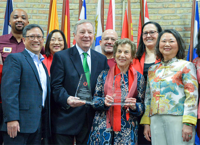 即将退休的国会参议员迪克·杜宾(Dick Durbin),国会众议员柴考斯基(Jan Schakowsky)当天亲临现场。这两位伊州重量级国会代言人,数十年来在国会为芝加哥及伊州的移民、难民社区发声,深得移民社区的尊敬。由杜宾参议员推动的梦想法案,让很多无证移民家庭的子女可以有途径获得美国公民身份,影响尤其深远。华人互助会特别向两位国会政要颁奖,以表彰他们的杰出贡献。