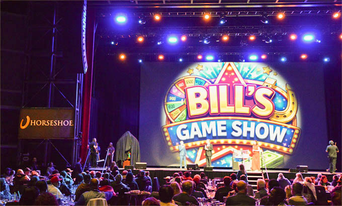 特别值得一提的是,马蹄铁舞狮贺岁当天,恰逢盛大的Bill's Game Show酬宾庆典,拥有Caesars Rewards的七星会员至尊贵宾、钻石会员的千名贵宾欢聚在马蹄铁二楼The Venue剧场,该剧场平时是各种演唱会与大型聚会的举办地,酬宾当天则变身盛大宴席,来宾们享受美酒美食,参与各种惊喜抽奖,全场欢呼喝彩不断。