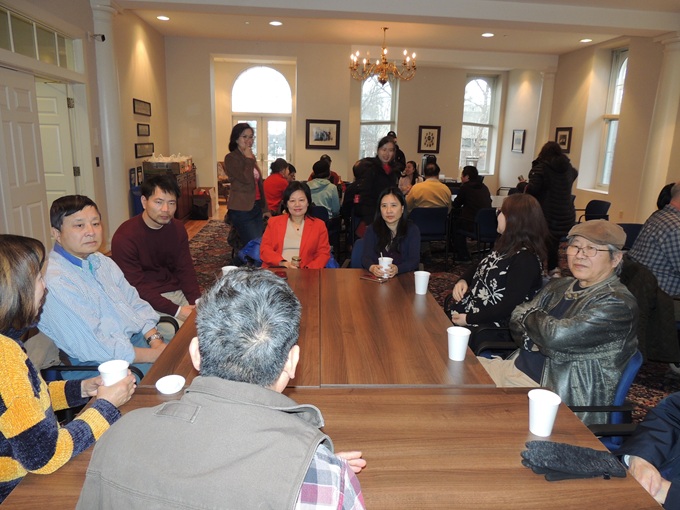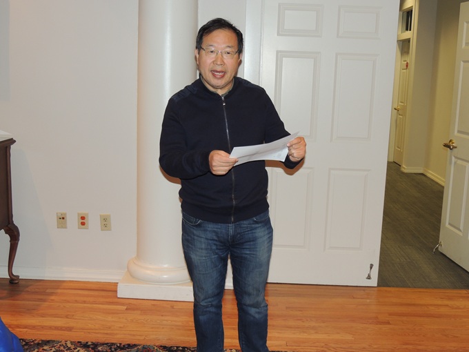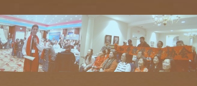 芝加哥、洛杉矶两地教授协会连线庆祝春节,洛杉矶会场,芝加哥教授学者协会会长王坚(前右)致辞