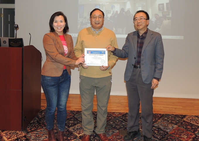 芝加哥教授学者协会会长王坚和中北大学孙金爱教授向孙贤和教授颁发“杰出社区贡献奖”