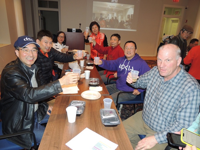 会议厅禁止饮酒,大家畅饮无酒精葡萄酒,其乐融融,增添了庆祝春节的喜乐气氛。