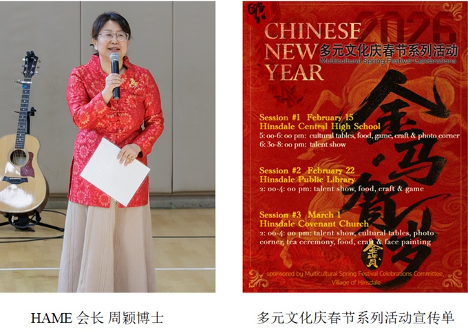 【芝加哥侨学网讯】2026年2月15日,芝加哥西郊欣斯代尔(Hinsdale)市(村)迎来了第三届“多元文化庆春节”系列庆祝活动。本届活动由社区非营利组织HMAE(多元文化艺术与教育协会)主办,共举行三场庆祝活动:首场在欣斯代尔中央高中举行,第二场在欣斯代尔公共图书馆举行,第三场则在当地契约教会举行。连续三个周末的系列庆祝,充分体现了跨文化、跨民族、跨代际和跨社区的特点,成为社区居民共同参与、共同分享的文化盛会。