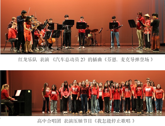专为农历新年庆祝而成立的“红龙乐队”今年招募到了18名来自管乐队与弦乐团的学生,演奏了两首分别代表东、西方音乐特色的作品。高中合唱团的指导老师Ms. B.K.带领学生们演唱了两首歌曲。