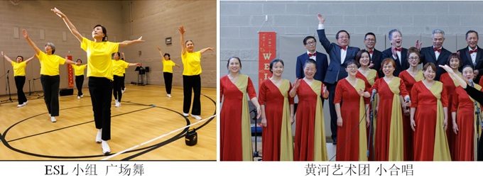 图书馆ESL英语学习小组不仅带来了合唱节目,还表演了充满活力的广场舞,与黄河艺术团的演员们共同展现了华人社区文艺团体的风采。
