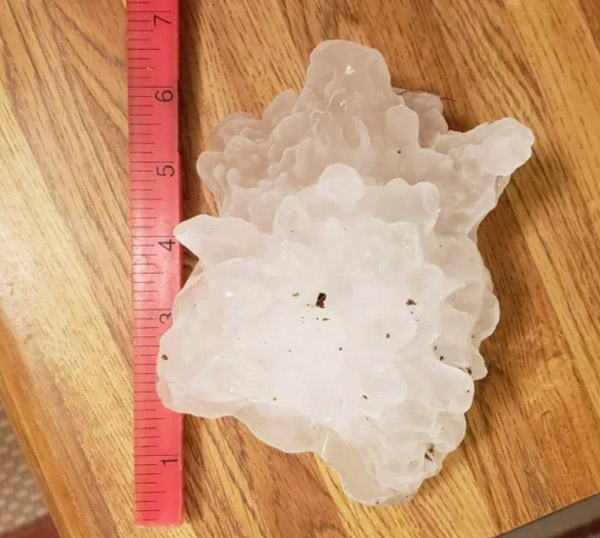 这个超级大冰雹是不规则形状,宽达7.125英寸,重达16.5盎司(1磅出头)。伊利诺伊州自1950年代开始记录最大的冰雹尺寸,此前最大历史记录直径仅为4.75英寸。简斯尼捡到的最新记录目前尚未得到国家气象局的官方确认。