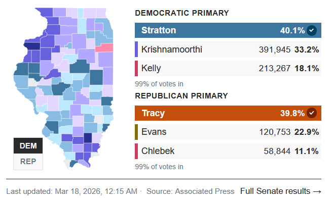 【芝加哥侨学网时事述评】3月17日伊州初选结果出台,国会参议员、国会众议员、州长、州务卿、库克郡郡长等各级政府公职的两党候选人均尘埃落定。