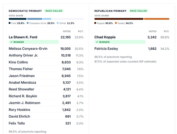 民主党阵营共有13人参选,共和党派也有2人参选。在竞争激烈的民主党阵营,拉肖恩·福特(La Shawn Ford)得现任国会议员丹尼戴维斯的支持,最终以23.9%的得票率胜出。