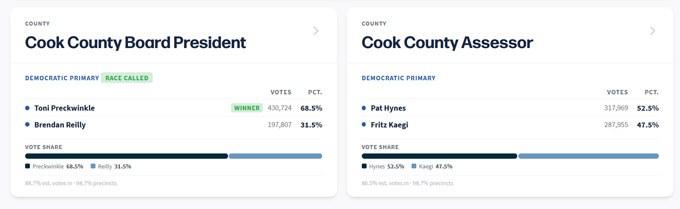 库克郡郡长普瑞雯科在本次初选中击败党内挑战者,获民主党提名。由于没有共和党派候选人,79岁的现任郡长11月将不战而胜,自动五连任。