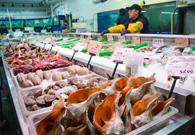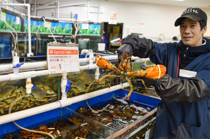 88超市海鲜区,龙虾、大蟹、生蚝、海螺等选择最为丰富,来自阿拉斯加的皇帝蟹更是常年供应。游水红立鱼,盲槽(大嘴鲈鱼)等淡水鱼类,新鲜宰杀,现场清理,服务热情周到。