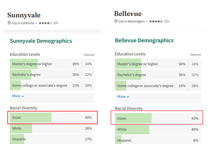 前十强榜单中,六个城市的亚裔人口比例均超过20%。加州珊尼维尔市(Sunnyvale, CA)、华盛顿州贝尔维优市(Bellevue)的亚裔均为第一大族裔,比例分别为49%,43%。相比而言,全美亚裔人口约2400万,总人口比例仅为7.2%。