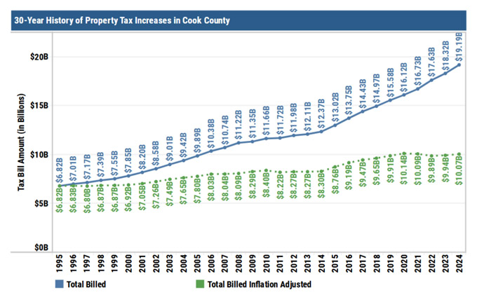 1995-2024,库克郡房产税总额飙涨182%,是91%通胀率的两倍