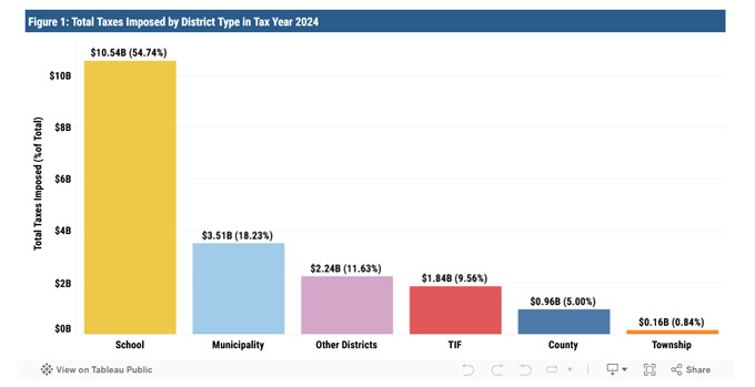 在2024年库克郡192亿美元的房产税征收总额中,55%以上为公立学校收取,市政府征税份额排第二,但只占18%。