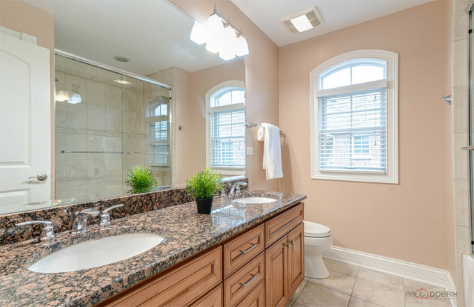 二楼主卧拥有超大卧室,配备豪华卫浴,双梳洗台,冲浪浴缸,独立淋浴间,高档地砖,花岗岩台面,整体风格时尚豪华。二楼两间次卧共用一套卫浴间,同时洗衣房也在二楼,高档洗衣机、烘干机齐全,十分方便。二楼还有公共厅堂设计,是第二套在家办公的好场所,也是给小朋友讲睡前故事的好地方。