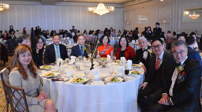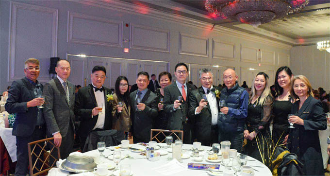 各界来宾与王保东总领事合影,左一为华联会主席黄正东,左四为华商会会长李建明,右三为芝加哥美国广东商会会长陈健明