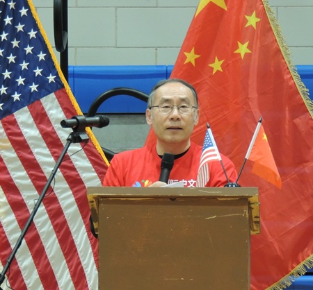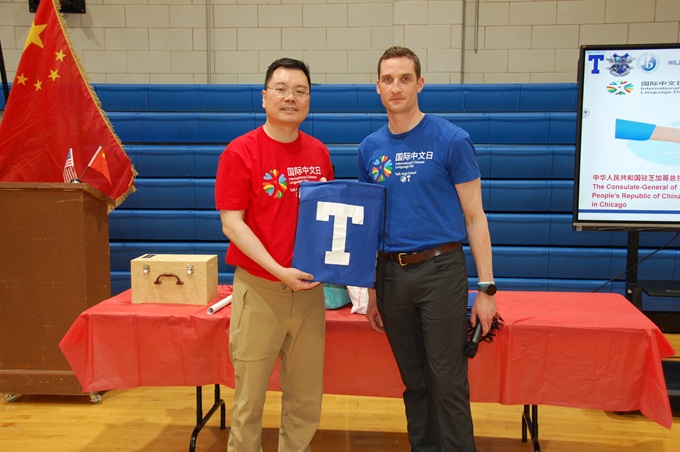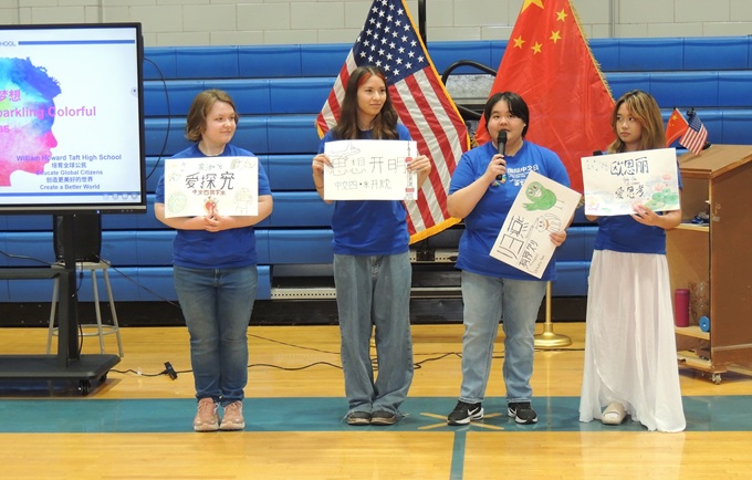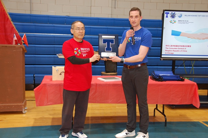 中国驻芝加哥总领馆王保东总领事讲,如今全球有超 2亿中文学习者,中文成为连接世界的重要纽带。我很高兴了解到塔夫特高中有300余名同学正在学习中文,今天我特意带来了中文教学用具和最新版中国地图作为礼物,辅助大家了解一个更真实、立体、全面的中国。