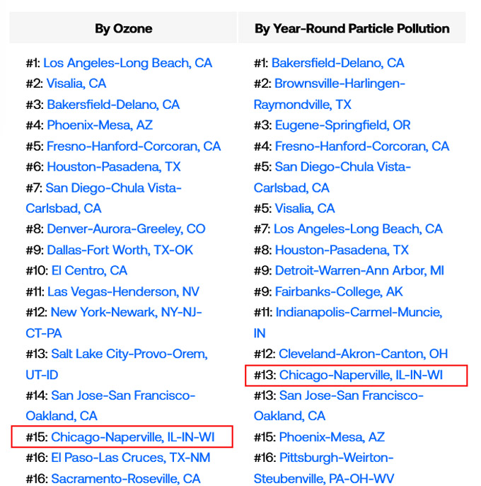 【芝加哥侨学网编译】4月22日是地球日,美国肺科协会(American Lung Association)公布全美空气质量研究报告,芝加哥地区的空气质量为F级,位列全美空气污染最严重城市位列前15名: