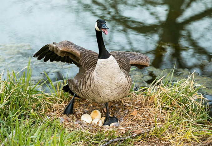 目前正值繁殖期,郊外乃至居民区都可能会有加拿大鹅筑巢孵卵