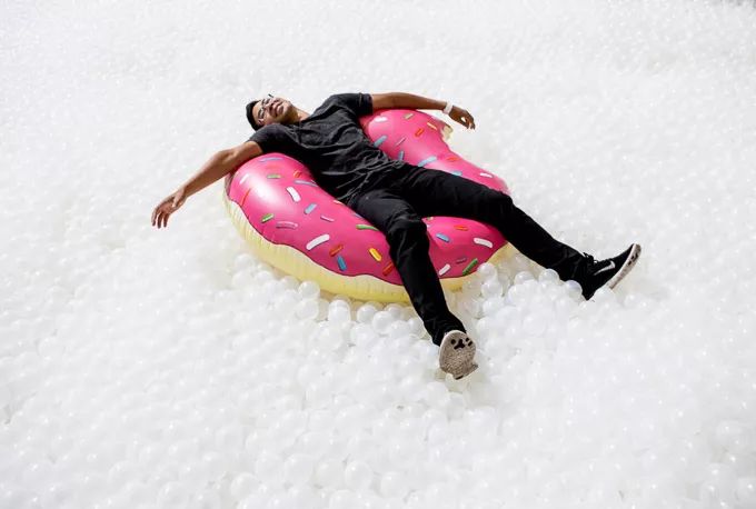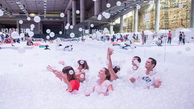 展厅巨型的空间内装满百万个塑料球,塑料球轻软蓬松,人们置身其中就好像漂浮在大海中一样。展厅内还特别放置了象征海边的阳伞,救生塔和沙滩椅,完全一副热带沙滩的度假画面。