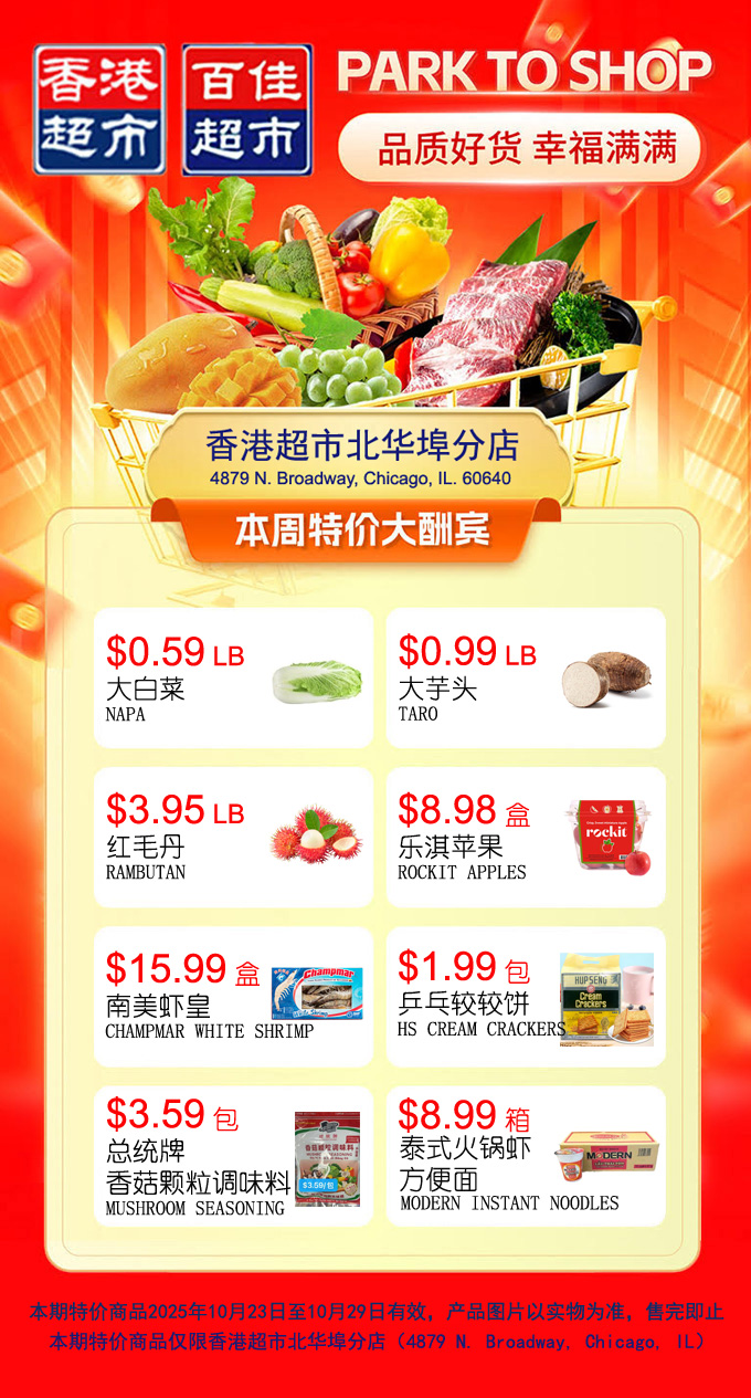香港超市中国城总店,毗邻芝加哥中国城,大型免费停车场。海鲜肉食、新鲜果蔬、卤水烧腊、参茸海味、药材补品,来自祖国大江南北的家乡调味酱料,最流行的中国零食与日韩风味,品质好货,应有尽有。
