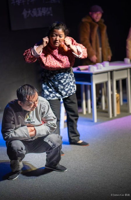 张力饰演的特派员,则以夸张而精准的肢体语言和节奏感,塑造出一个滑稽、愚昧的官僚形象。他身上的荒诞感,既令人发笑,又让人反思。刘承熹饰演的裴老师,老谋深算,圆滑世故。他的演绎赋予了人物灵魂,使人物活灵活现,个性十足。黄海燕饰演的张一曼,是剧中最悲怆的人物。她的表演,从最初的傲气与自尊,到被现实击碎后的崩溃,层次分明,把握准确。李力扬饰演的铁匠,是全剧的悲剧象征 — 他质朴、憨厚,却被命运反复践踏。李力扬抓住了人物的特点,他的表演生动鲜活,令人印象深刻。张熙饰演的铁嫂泼辣真挚,性格鲜明,她在强势外表下隐藏的脆弱与爱意,让角色不流于表面,而多了几分人性的温度。 安达饰演的角色性格血气方刚,行事激烈,故事末尾的悲剧命运令人唏嘘。悠悠饰演的佳佳,天真纯洁、活泼可爱,象征着希望与善良,是这出荒诞剧中的一抹光亮。