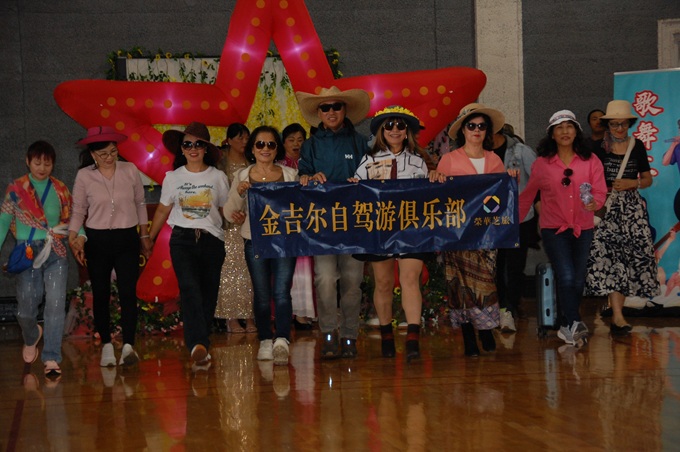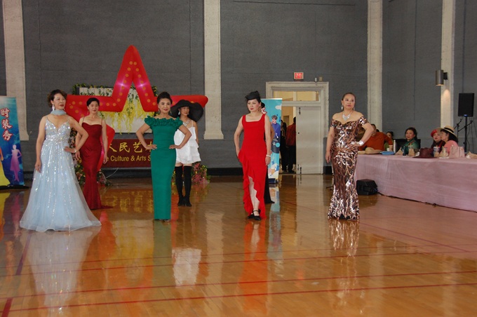 在走秀1,休闲民族风部分,在表演精彩歌舞节目的同时,还有金吉尔自驾游芝加哥分会的旅游时装秀、芝城乒乓球爱好者团队的体育时装秀。