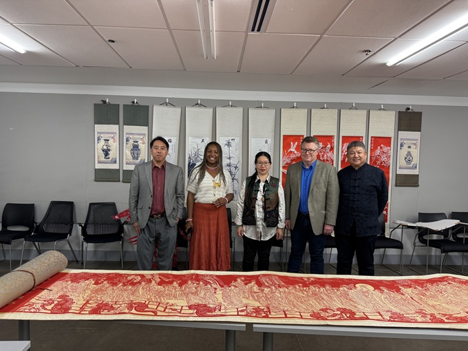 现场同步展出剪纸精品,包括中西方主题作品与长达33英尺的长卷(如《八十七神仙卷》《清明上河图》等),观众在互动之余系统欣赏剪纸的叙事深度与空间表达。
