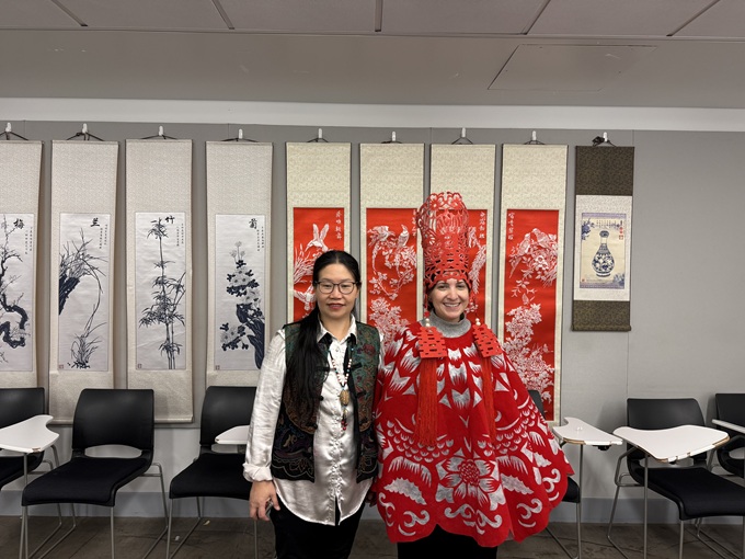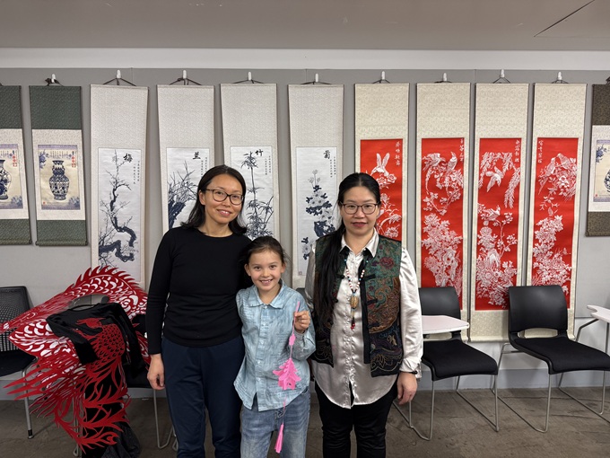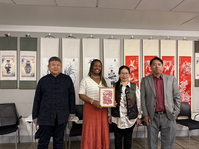 Dominique Boyd-Riley(教育与家庭项目副主任,左二)手拿剪纸作品,右为世界非物质文化遗产促进会发起人 John Hou