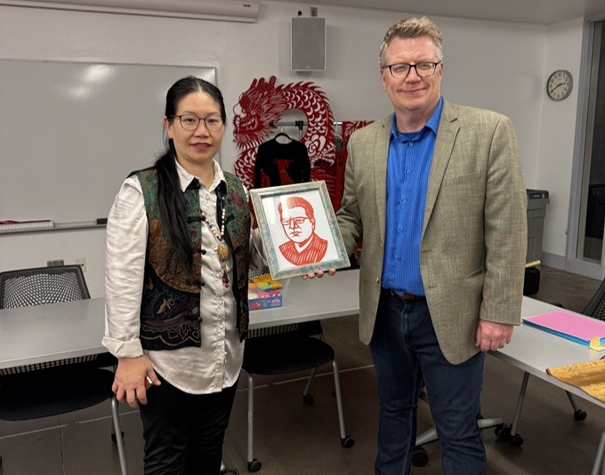 左起,张月英剪纸大师、Bill Michel手拿写真剪纸头像
