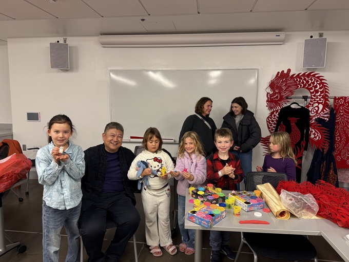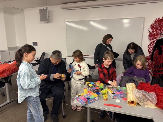 当日,芝加哥大学洛根艺术中心执行主任 Bill Michel(男)、艺术系主任 Emily、以及家庭项目负责人 Dominique Boyd-Riley到场观摩并亲自参与互动体验,与三位非遗大师、学生与家庭合影留念,现场气氛热烈。