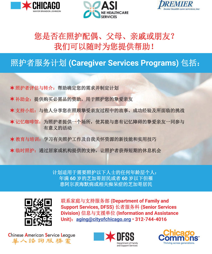 如果您家有60岁及60岁以上的老人需要您照顾,或者您需要照顾60岁以下但患有阿尔茨海默症、健忘症等相关痴呆症者,芝加哥市政府家庭与支持服务部(DFSS)为您提供各项协助,包括: