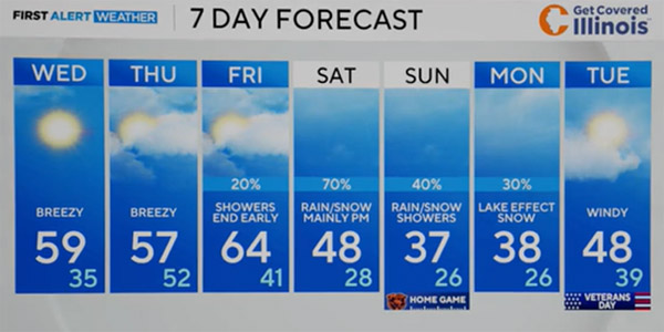 首当其冲的明尼阿波利斯市,周六白天气温将降至华氏40多度,夜间降至32度以下,本周日该市则可能出现超过0.1英寸的积雪。芝加哥地区的大降温将从本周六开始,11月7日白天最高气温预期降至48华氏度,周日将为华氏37度。本周六到下周一夜间的最低气温都将在华氏32度(摄氏零度)以下,并且连续三天都可能降雪或是雨夹雪。