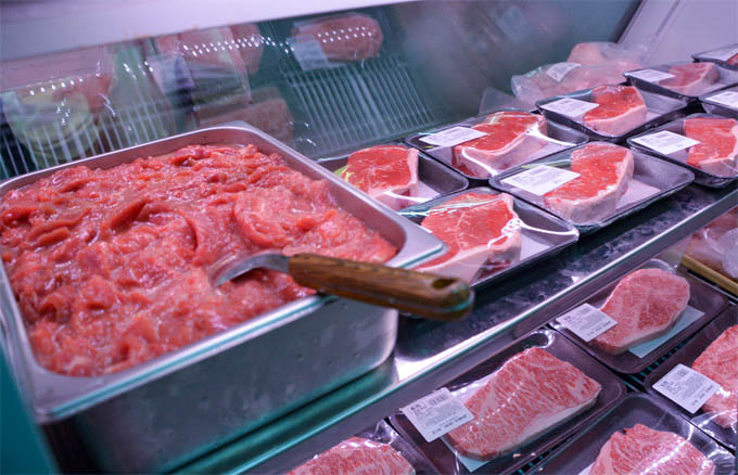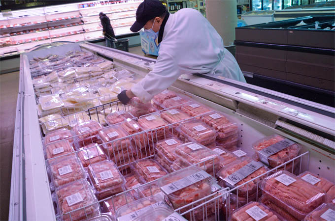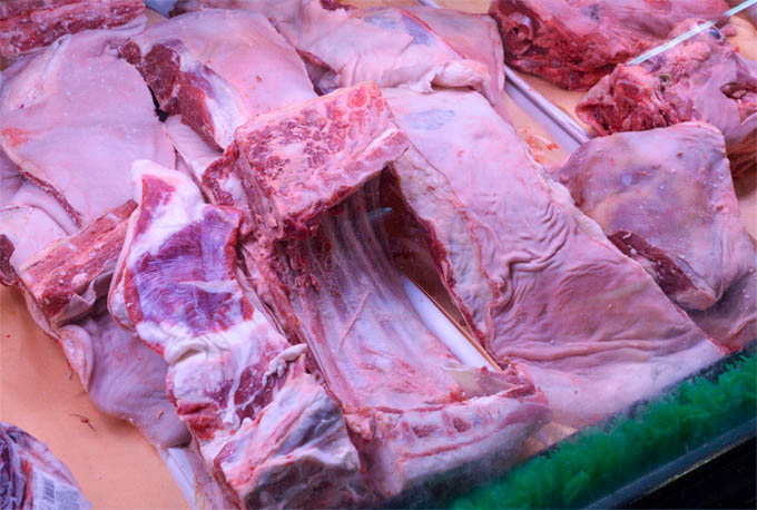 猪肉同样也是每天从屠宰场进货,而且几乎是每周七天天天进货,保证肉质新鲜。考虑到个头与尺寸,猪肉类则是按部位批量进货,品种最丰富。梅花肉、里脊肉、五花肉、猪肘、圆蹄、前蹄;排骨、扇骨、颈骨、脊椎骨;猪头肉、猪舌、猪肝、肥肠、小肠、猪心、猪血等美味猪杂碎,88超市肉品专柜一应俱全。