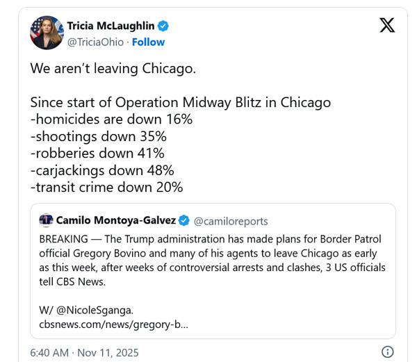 麦克拉芙林11月11日还在X平台发帖表示,自“中途闪电战”大抓捕行动开始以来,芝加哥市的谋杀案下降了16%,枪击案减少了35%,抢劫案降低41%,劫车案降低48%,公共佳通场所的犯罪减少了20%。