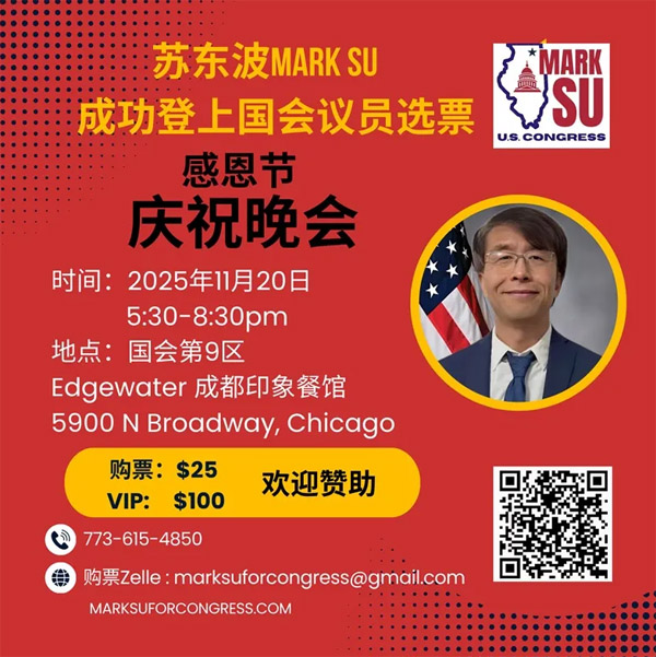 Mark Su是这次选举中的唯一华裔候选人,也是芝加哥乃至伊利诺州历史上第一个华裔国会议员候选人,开创了华人登上国会议员选票的历史,为了庆祝目前的进展,苏马克国会议员选举委员会将于11月20日(周四)在位于国会第9区的北华埠附近的成都餐馆举行庆祝会,邀请各界嘉宾共庆感恩节。