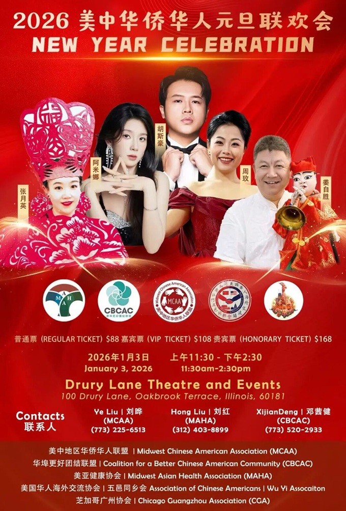 【芝加哥侨学网记者王坚报道】2026美中华侨华人元旦联欢会将于1月3日(星期六)在芝加哥西郊朱瑞莲酒店举行。