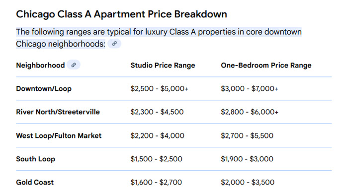 芝加哥市中心单间公寓(Studio)、一卧室公寓的租金价格区间