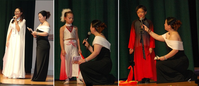 左起,获得专业艺术比赛大奖的古筝独奏《彝族舞曲》表演者Helin Wang、独舞《俏灵狐》表演者Norah Lin、男生独舞《月影游龙》表演者Jethro Lee接受主持人Peiyu的采访