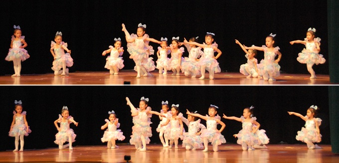 幼儿舞蹈《花儿盛开》,比较相隔一段时间拍的两张照片,可以看出学生在完成一个集体舞蹈动作之后,过一段时间回来重新做同一个集体舞蹈动作,每位学生的位置和动作都保持一致,反映了丹舞艺术学校在集体舞教学上要求严格,也反映了学生们认真排练。