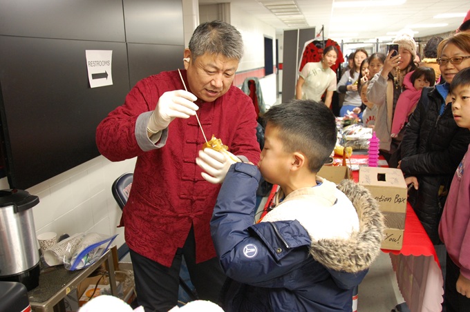 希林西北中文学校学生排长队等待吹制糖塑生肖动物