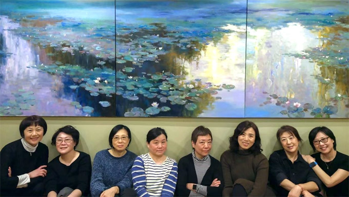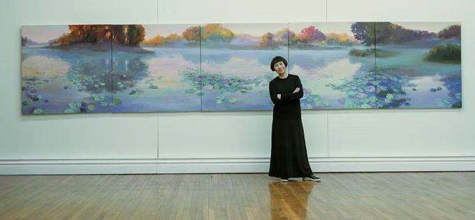 「荷池系列」,從每年的室外寫生到畫室內的創作,尤其是疫情中的三年,把小幅寫生延伸到大幅創作,再進一步三聯畫、五聯畫,共完成了「荷池系列」二十多幅,其中不少已被藏家收藏。這此展出的「荷池系列」中的五聯幅和三聯幅,以及單幅作品,都是在寫生的基礎上的再創作,没有有具體的素材,更多的是主觀的再創意,畫面展示的光色、空间和笔趣,是自我營造的心中之景和向往的光色,借「荷池」表意。