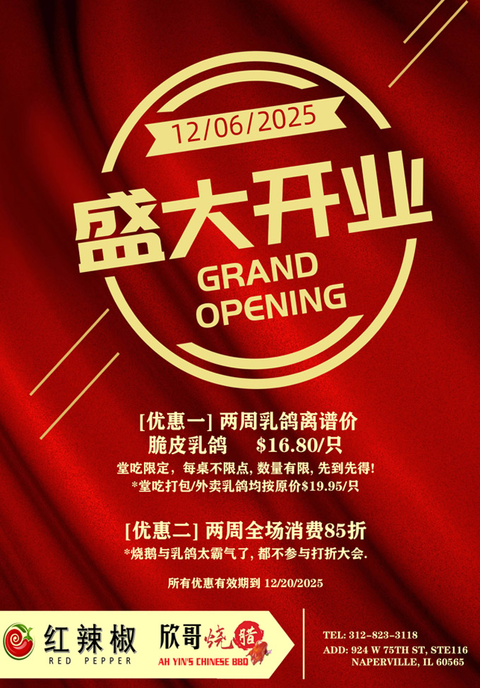 想吃正宗川菜,喜欢广式烧腊?芝加哥西郊的朋友们有口福啦!位于瑞柏市(Naperville)75街的红辣椒餐厅全新开业。即日起至12月20日期间,双重优惠,双喜临门!