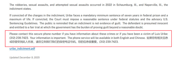 由于系列案件的受害者均为华人,司法部北伊州地区检察长办公室12月9日发布公告时,特别在结尾处用中文呼吁知情者、受害者联系司法部,并提供了可讲中英文双语的保密电话:312-239-7423。