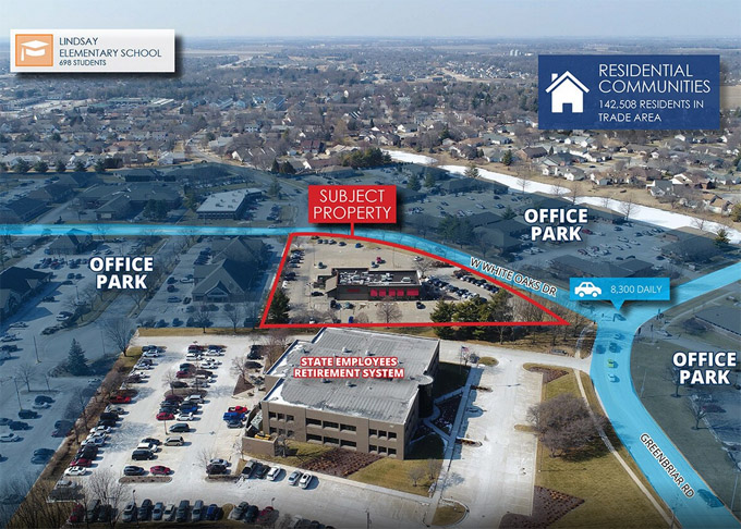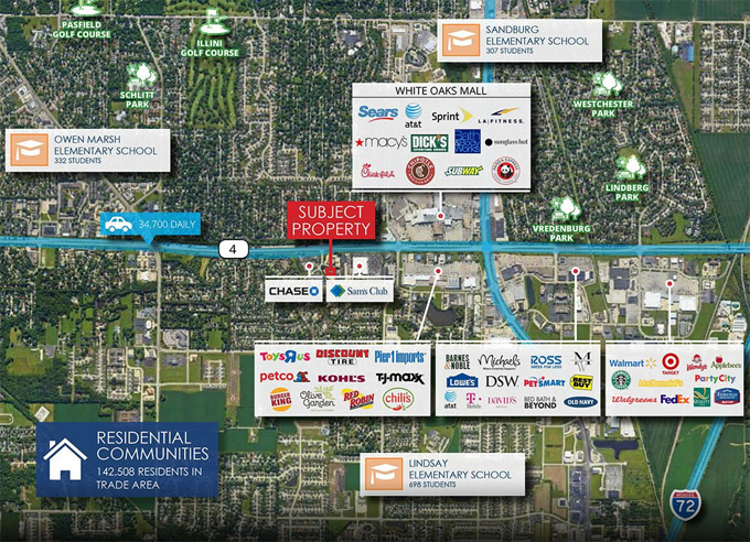商铺毗邻著名的White Oaks Mall购物中心,位于72号高速与伊州4号路交汇区域,4号本地公路平均每日车流量接近3.5万。周边大牌商家云集,包括沃尔玛、Target、Lowes、Best Buy、Sam's Club等大型商场,麦当劳、Subway、汉堡王、Chipotle、Chili's、星巴克、熊猫快餐等众多餐饮名牌商家。