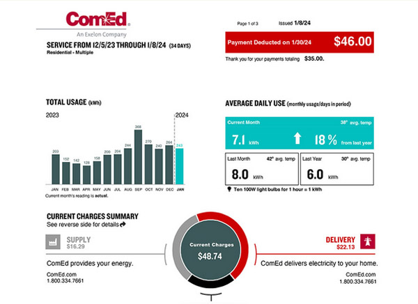 ComEd电力公司并不是发电厂,而是负责电力的投送与维护,该公司每年会以特定的价格向由全美发电商供给的电网购买用电量,价格会出现波动。相应地,ComEd电费账单主要包括电力投送费用、用电量费用两大部分,以及相关税收。